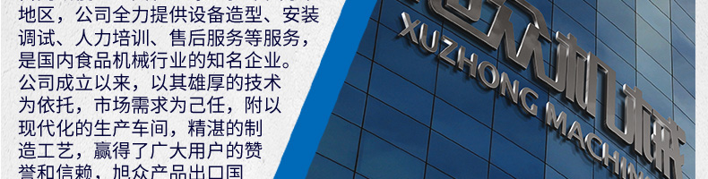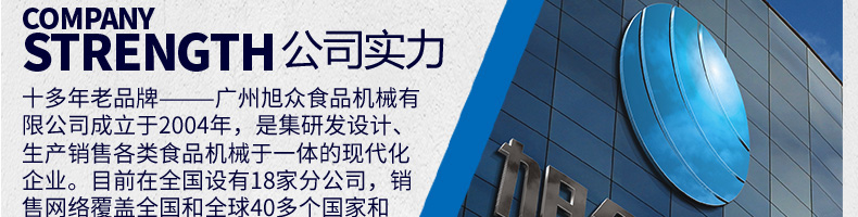 廣州旭眾食品機(jī)械有限公司是一家集科研開發(fā),生產(chǎn)設(shè)計(jì),營(yíng)銷服務(wù)為一體的現(xiàn)代化生產(chǎn)企業(yè)?,F(xiàn)代化生產(chǎn)車間,精湛制造技術(shù),所產(chǎn)機(jī)械歷經(jīng)市場(chǎng)重重考驗(yàn),不斷贏得海內(nèi)外客戶的贊譽(yù)。
