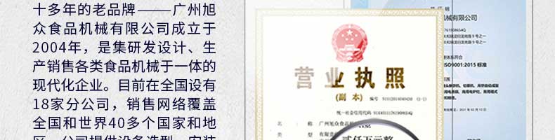廣州旭眾食品機械有限公司是一家集科研開發(fā),生產設計,營銷服務為一體的現(xiàn)代化生產企業(yè)?,F(xiàn)代化生產車間,精湛制造技術,所產機械歷經市場重重考驗,不斷贏得海內外客戶的贊譽。