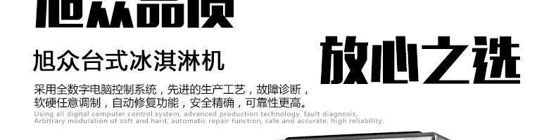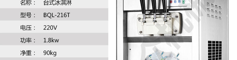 BQL-216T臺(tái)式冰淇淋機(jī),●選用國(guó)際名牌成熟制冷配套件和高效壓縮機(jī),融合旭眾精湛工藝輔以嚴(yán)格的質(zhì)量控制流程,使產(chǎn)品整體性能及品質(zhì)得以全面提升?!癫捎萌珨?shù)字電腦控制系統(tǒng),選用名牌優(yōu)質(zhì)電器元件,先進(jìn)的生產(chǎn)工藝,故障診斷,軟硬任意調(diào)制,自動(dòng)修復(fù)功能,安全精確,可靠性更高?!駥I(yè)成熟制冷系統(tǒng)設(shè)計(jì),選用世界名牌大功率專用壓縮機(jī),大大縮短冰淇淋成型時(shí)間,相同時(shí)間內(nèi)冰淇淋產(chǎn)量大幅度增加,使您生意火爆時(shí)依然得心應(yīng)手,為您創(chuàng)造財(cái)富。●安全平穩(wěn)的機(jī)械攪拌系統(tǒng),噪音更低、振動(dòng)更小,使整機(jī)運(yùn)行性能達(dá)到國(guó)際先進(jìn)水平?!翊_保進(jìn)料溫度在0°C~35°C;環(huán)境溫度5°C~40°C勻可正常使用。