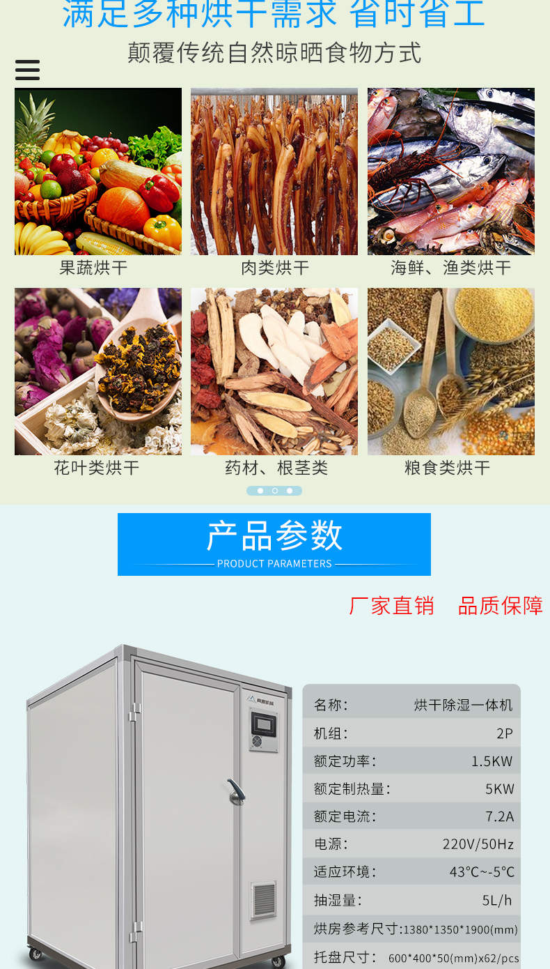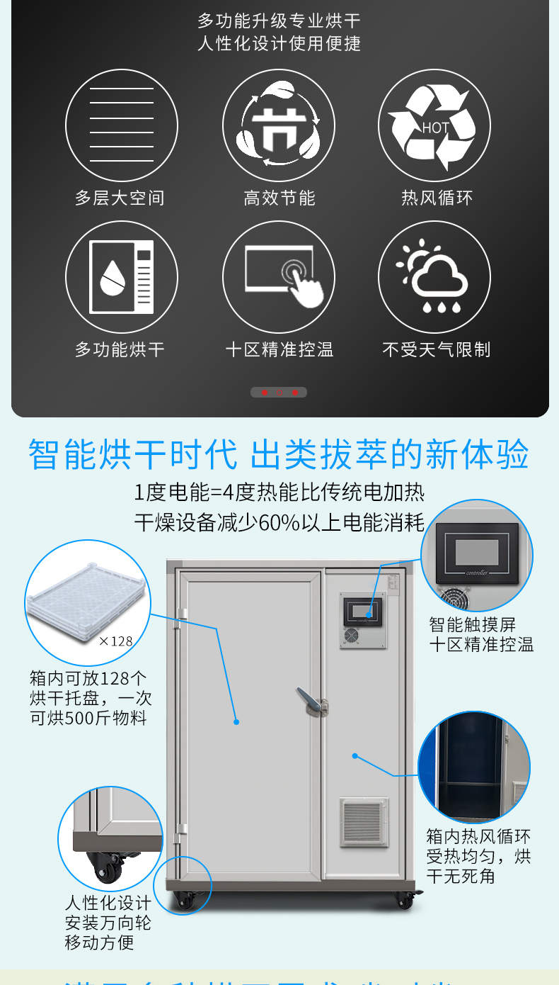 烘干除濕一體機,烘干除濕體機,智能觸屏精準控溫熱風循環(huán)均勻烘干次可烘干500斤,智能烘干時代出類拔萃的新體驗,1度電能=4度,熱能比傳統(tǒng)電加熱。干燥設備減少60%以上電能消耗。