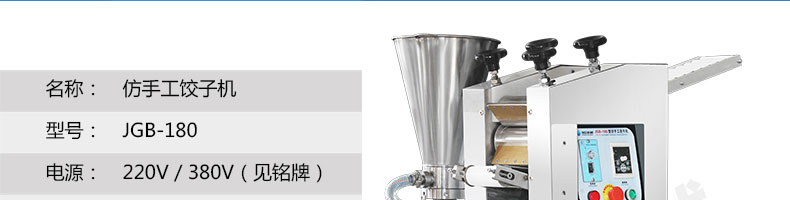 JGB-180餃子機(jī),先進(jìn)的自動餃子生產(chǎn)設(shè)備,包括主動壓皮部分、自動供餡部分、自動包合部分、自動成品輸送部分,并且只要更換模具,就可制鍋貼等食品。適合食品速凍廠、飯店、廠礦學(xué)校食堂等制作包餡面制品單位使用。