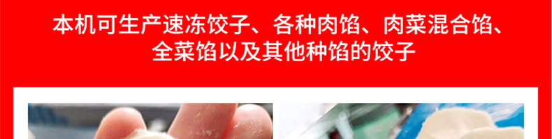 210豪華餃子機,實力強勁、超高效率一小時可做大約20000個餃子!可生產(chǎn)速凍餃子、各種肉餡、肉菜混合餡、全菜餡以及其他種餡的餃子。
