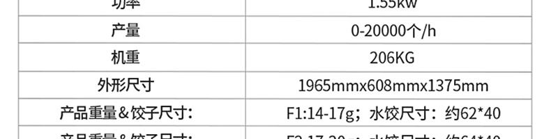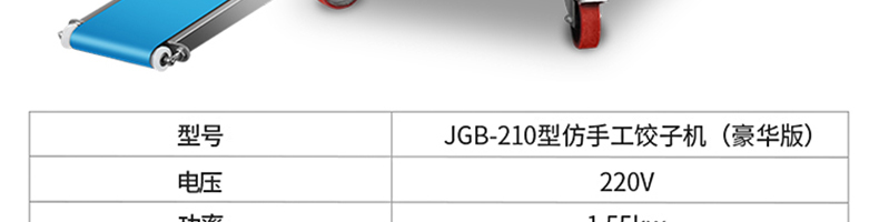 名稱210豪華餃子機 電源220V 功率1.55kW 產(chǎn)量0-20000個/h 尺寸1965mmx608mmx1375m 重量206KG 規(guī)格請咨詢銷售員 其他