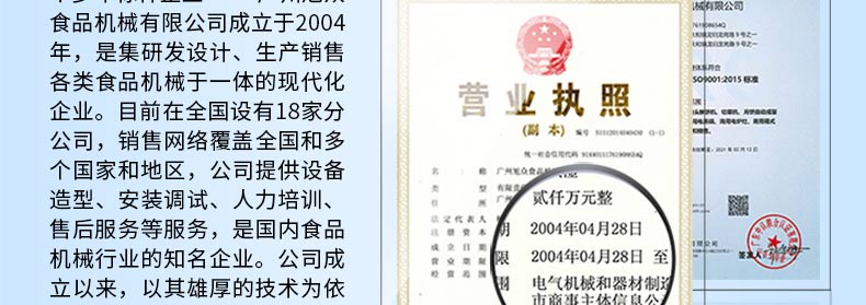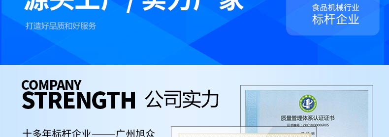 廣州旭眾食品機(jī)械有限公司是一家集科研開發(fā),生產(chǎn)設(shè)計(jì),營銷服務(wù)為一體的現(xiàn)代化生產(chǎn)企業(yè)?,F(xiàn)代化生產(chǎn)車間,精湛制造技術(shù),所產(chǎn)機(jī)械歷經(jīng)市場(chǎng)重重考驗(yàn),不斷贏得海內(nèi)外客戶的贊譽(yù)。