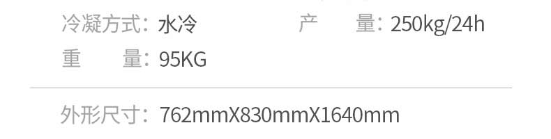 名稱500制冰機(jī) 電源220v 功率1kw 產(chǎn)量250kg/24h 尺寸762*830*1640mm 重量95kg 規(guī)格 其他