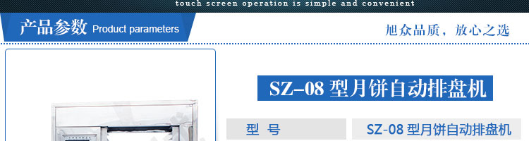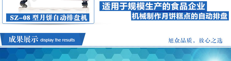 SZ-08型月餅自動(dòng)排盤機(jī),可同于制作各種月餅。適用于蛋糕房、休閑食品廠、食品加工產(chǎn)、面包房、月餅加工廠、超市、學(xué)校、食堂等各種工作場所??蓾M足不同客戶群體。免費(fèi)提供工藝技術(shù)。